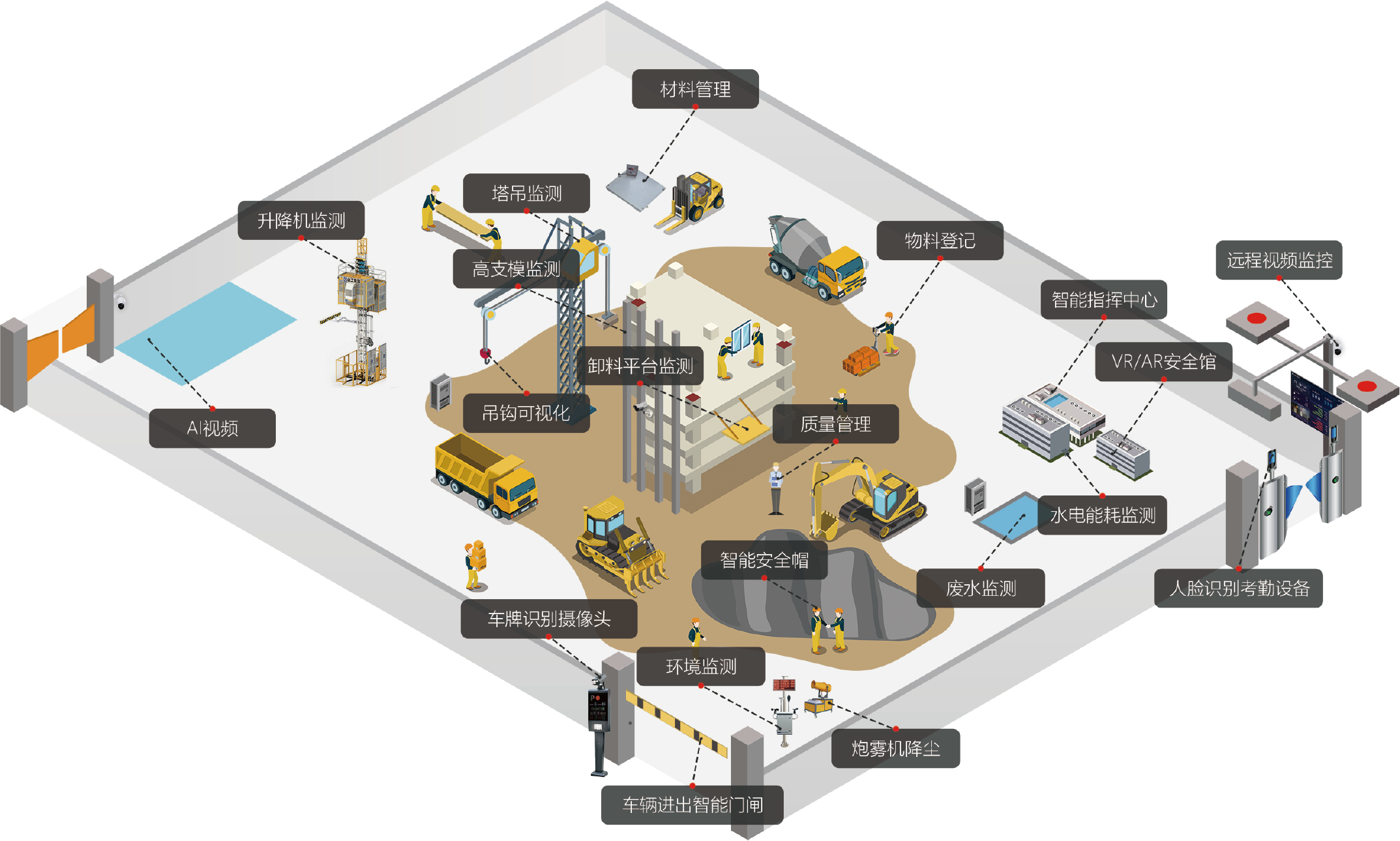 强大的管理功能:支持人员进出口通道管理,通过PAD人脸识别实现现场封闭式人员管理;支持车辆出入过磅通道监测及车辆冲洗时长,冲洗是否达标检测;支持温湿度、风力、PM2.5、噪音监测;扬尘、喷淋联动等环境监测管理及远程控制;支持安全帽、塔吊、物料、危险区域入侵、吸烟监测管理。